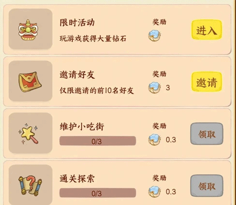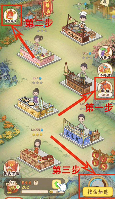 想要快速积累收益,新手阶段建议优先完成引导任务,完成后可直接获得现金奖励。系统初始会赠送多个摊位,这些摊位能持续产出金币,而金币正是推动发展的核心资源。通过不断升级摊位等级,金币产出效率将显著提升。当所有摊位达到五星后,再集中资源提升繁荣度更为高效,因为每提升100点繁荣度即可抽取一次小吃,五星摊位还能提高抽取数量。