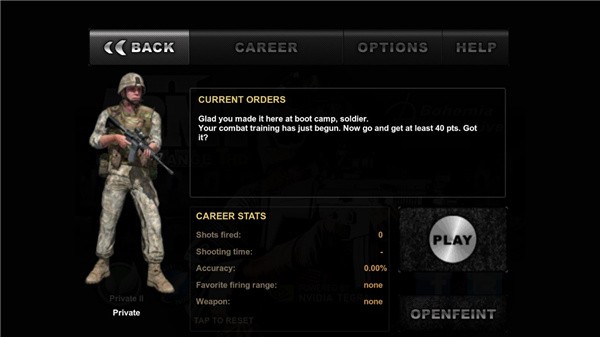 点击中央的“career”按钮即可开启主线征程,随后可自定义角色外观并确认进入战场。