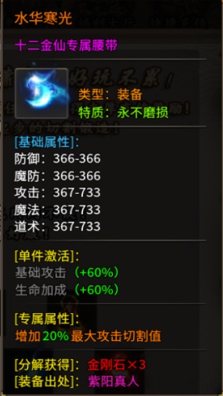 水华寒光是十二金仙专属腰带,寒气逼人,强化输出与敏捷。
