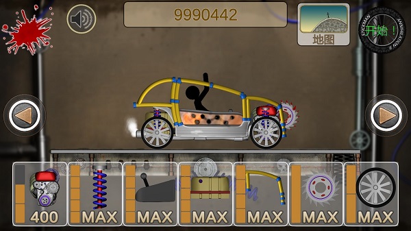 玩家驾驶战车在战场上对抗各类火柴人敌人,车身装备不仅能承受射击还能抵御猛烈撞击。屏幕左侧控制重心前后调节,在飞跃或冲撞时有效防止翻车;右侧为油门键,长按即可触发冲刺状态。战车可通过升级马达轴承来增强整体性能,也可强化绞肉器或火焰喷射器以提升输出火力。