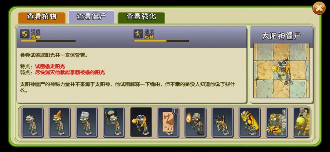 太阳神僵尸会在场上存在未拾取阳光时举起权杖,将阳光染红并吸收,最多可吸收约250点。死亡后会返还所吸阳光,染红阳光仍可正常拾取。