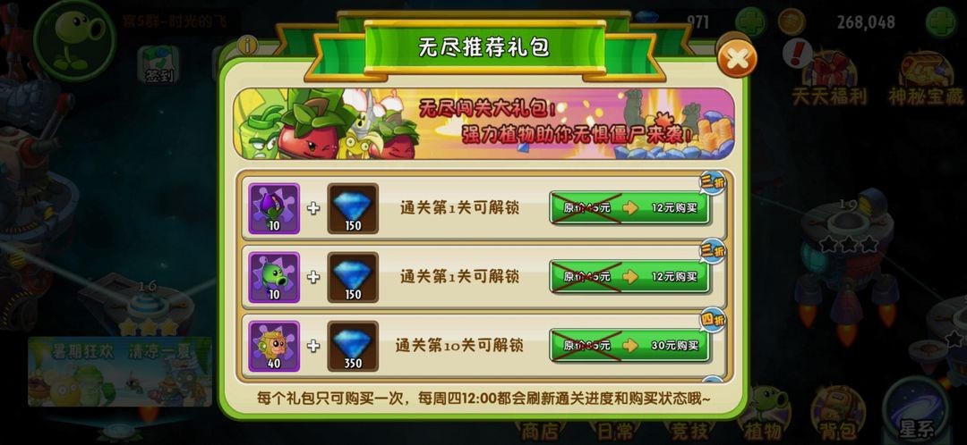 推荐礼包性价比偏低,不建议购买。推荐商店每周随无尽主题世界变化,所售植物可用钻石购买。无尽开启前享有八折优惠,开启后恢复原价,稀有度越高的植物价格越高。