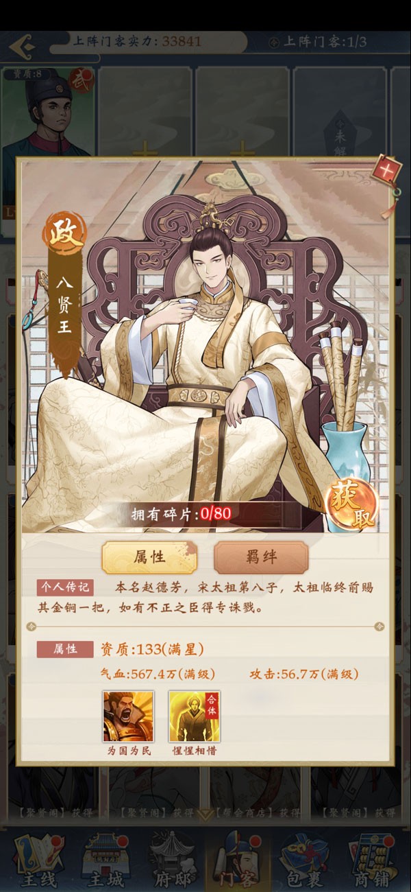 门客分为武、智、才、政四大类型,各司其职。品级以色阶区分,绿色为最低,红色为最高。