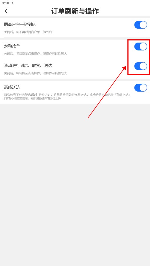 将“滑动抢单”和“滑动进行到店、取货、送达”两项功能全部开启,即可体验更迅捷的接单与配送操作。