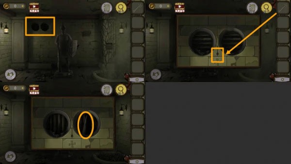 从盾牌上取下【金属圆片】,再用刚获得的【钥匙】插入附近钥匙孔,取出【十字架】。