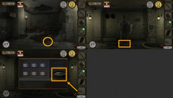 在棺材旁边拾取【石头】,利用它砸碎雕像下方的陶碗。