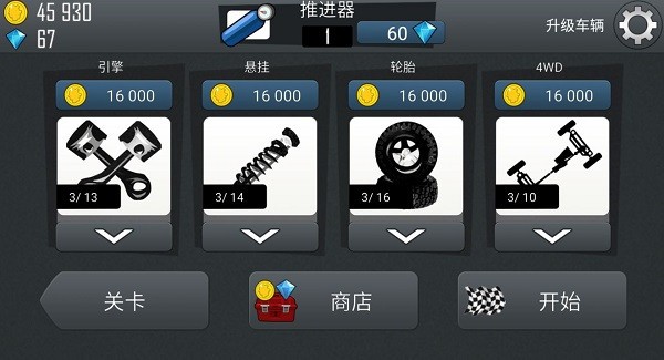升级部件包括发动机、悬浮系统、轮胎及四轮驱动装置。