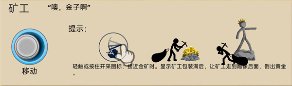 当靠近金矿时,轻触或按住开采图标即可开始采集。矿工背包装满后,会自动返回雕像后方倾倒黄金,完成资源收集流程。