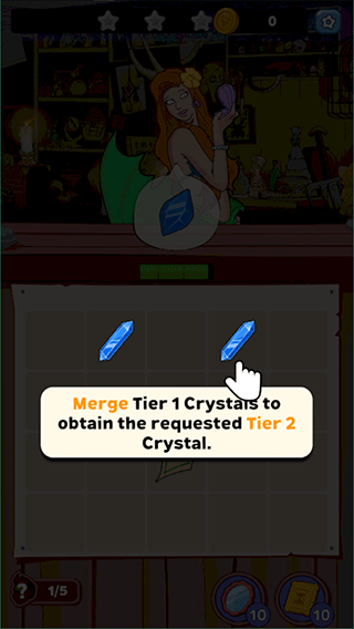 通过拖动相同等级的一级晶体进行合并,合成出顾客所需的二级水晶。