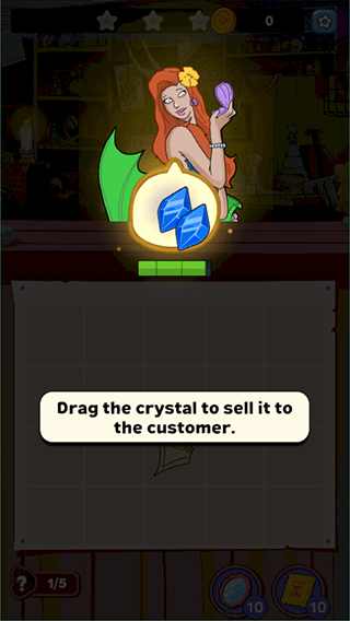将合成好的二级水晶卖给顾客,用心服务每一位访客,努力赚取更多金币。