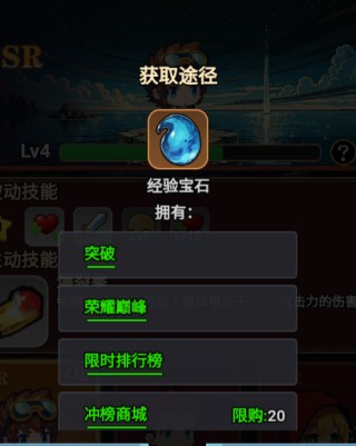 通过地宫探索、突破奖励或排行榜奖励获取经验水晶,用于提升英雄等级,增强基础属性。