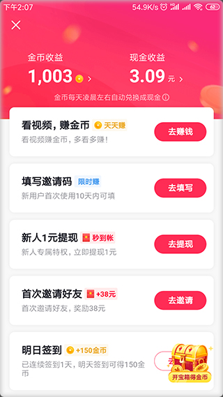 打开抖音火山极速版客户端后,完成观看视频、邀请好友等指定任务,即可获得相应金币或现金红包奖励。所获金币会在次日凌晨自动折算为现金红包,并计入个人账户。