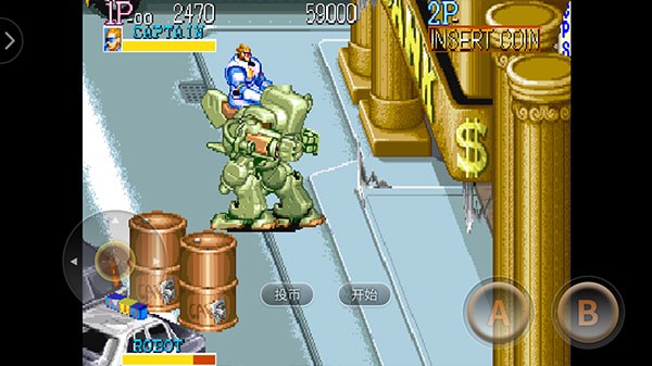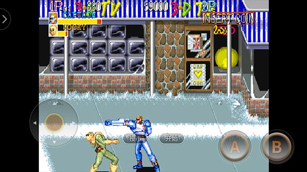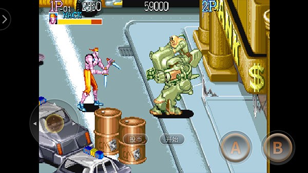 正式进入关卡后,左侧虚拟摇杆控制角色移动,右侧A键用于出拳或拾取武器,B键负责跳跃闪避。
