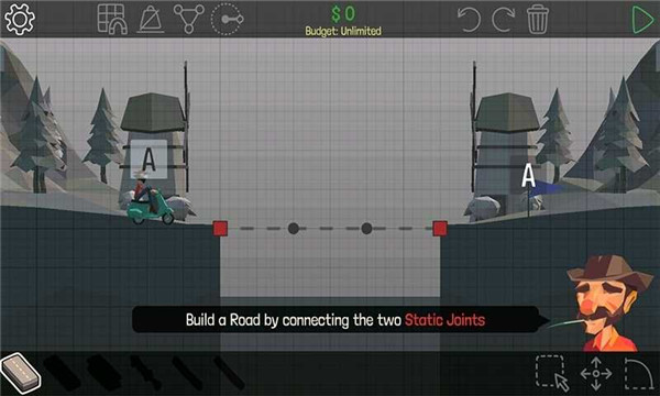 第一关为新手引导关卡,系统会提供基础操作说明。修建界面中已标出虚线结构,只需按提示铺设木板即可。注意桥梁必须从白色锚点起始或终止,否则结构无法稳固。完成搭建后启动车辆,安全通过即算过关。