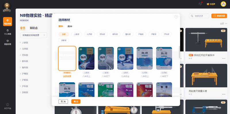 在左上角选择对应学段,点击右上角“新建资源”,进入后挑选所需模块,例如物理中的电与磁部分,即可开始实验。