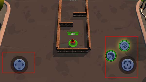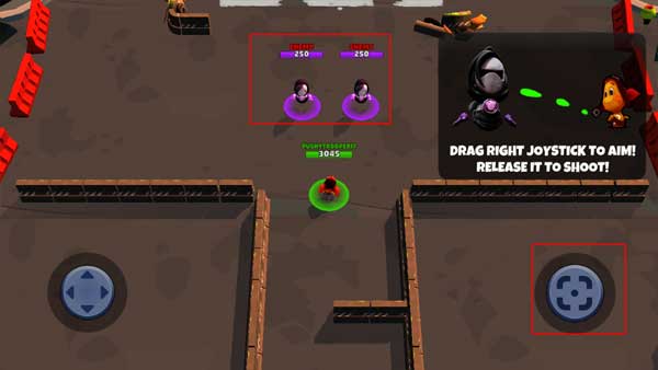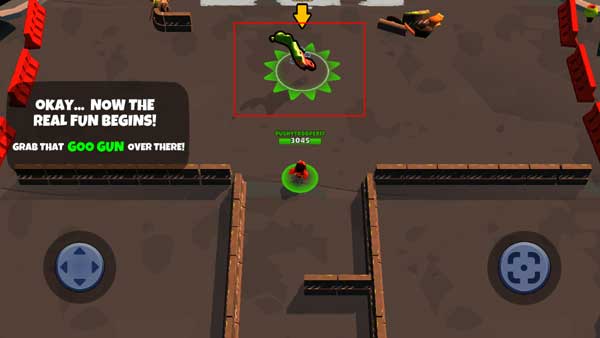 游戏开局配有简洁的新手引导,左侧虚拟摇杆控制角色移动,右侧设有攻击按钮,可发射飞镖、导弹或喷射彩色颜料。