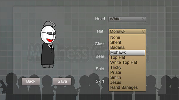 在右侧菜单中可分别调整head、hat、glass、shirt等部位,自由搭配发型、眼镜、肤色及服装样式,设定完成后点击Save保存角色外观。