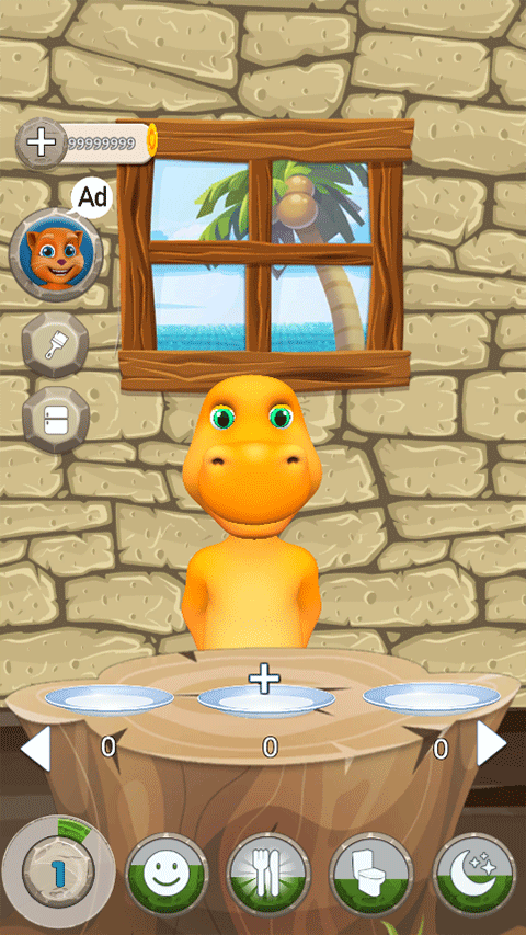点击底部功能按钮能切换不同场景,比如喂食环节,让恐龙享受美味。