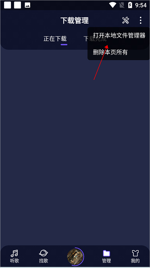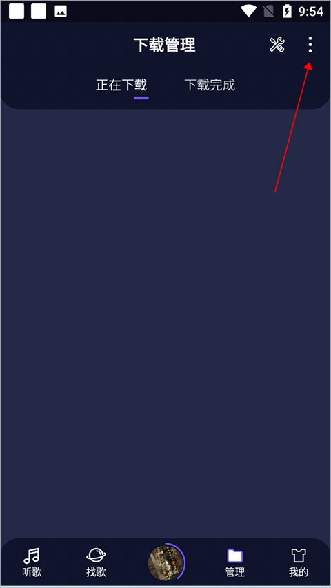 打开flymusic应用后,进入【管理】页面,点击右上角的扩展菜单图标(如下图红色箭头所指位置)。