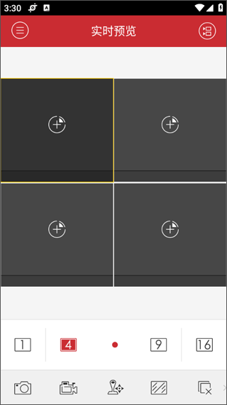底部提供多种画面分割选项,便于同时查看多个通道。