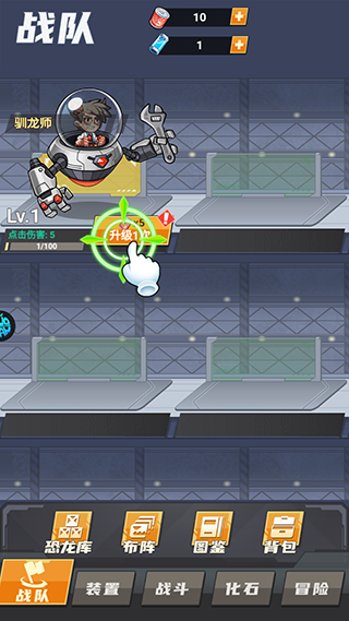 在战队界面中,玩家可为主角或已拥有的恐龙进行升级,提升整体战力。