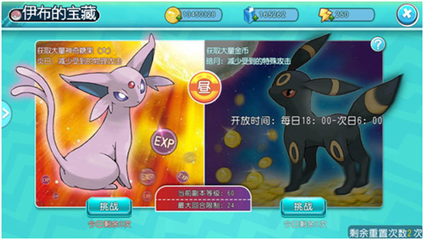 伊布的宝藏分为太阳与月亮两类,太阳副本敌人防御高,掉落精灵经验道具;月亮副本特防强,产出大量金币。副本在每日固定时段开放,随玩家等级提升(35级、40级、50级),难度与奖励同步增强。