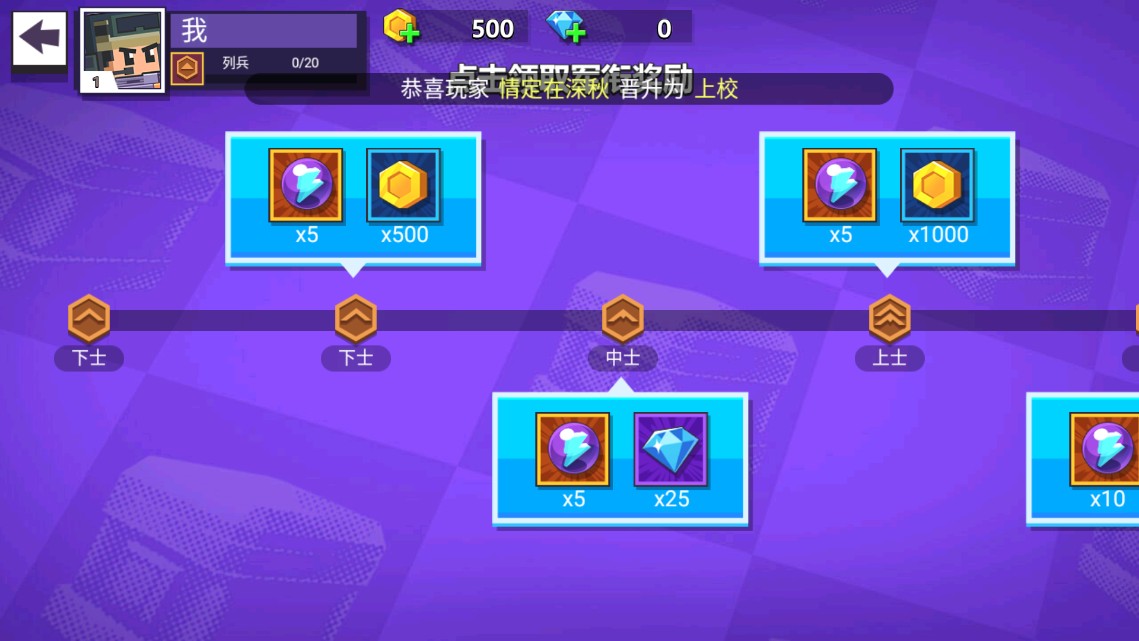 随着军衔等级提升,不仅能解锁新内容,还能领取包含金币、钻石及属性点在内的阶段性奖励。