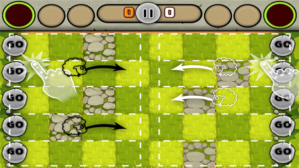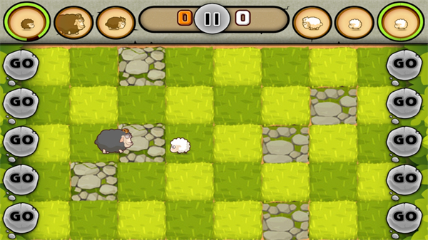 策略模式战场形如竞技擂台,点击上下两行的“GO”即可释放顶部准备区的小羊。遵循大羊克中羊、中羊克小羊的规则,类似拔河对抗,看谁的山羊更具冲劲。成功抵达对方阵地即可得分,最终以总分定胜负。