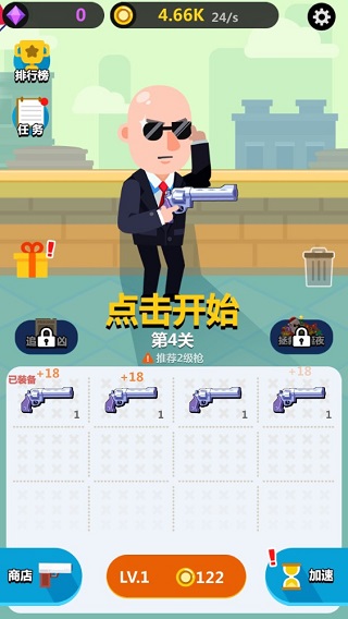除了主线闯关,游戏还融入了枪械合成系统。在主界面中,玩家可购买各类枪支,并将两把相同类型与等级的武器进行合成,从而提升装备性能,为应对后续更高难度的关卡打下坚实基础。